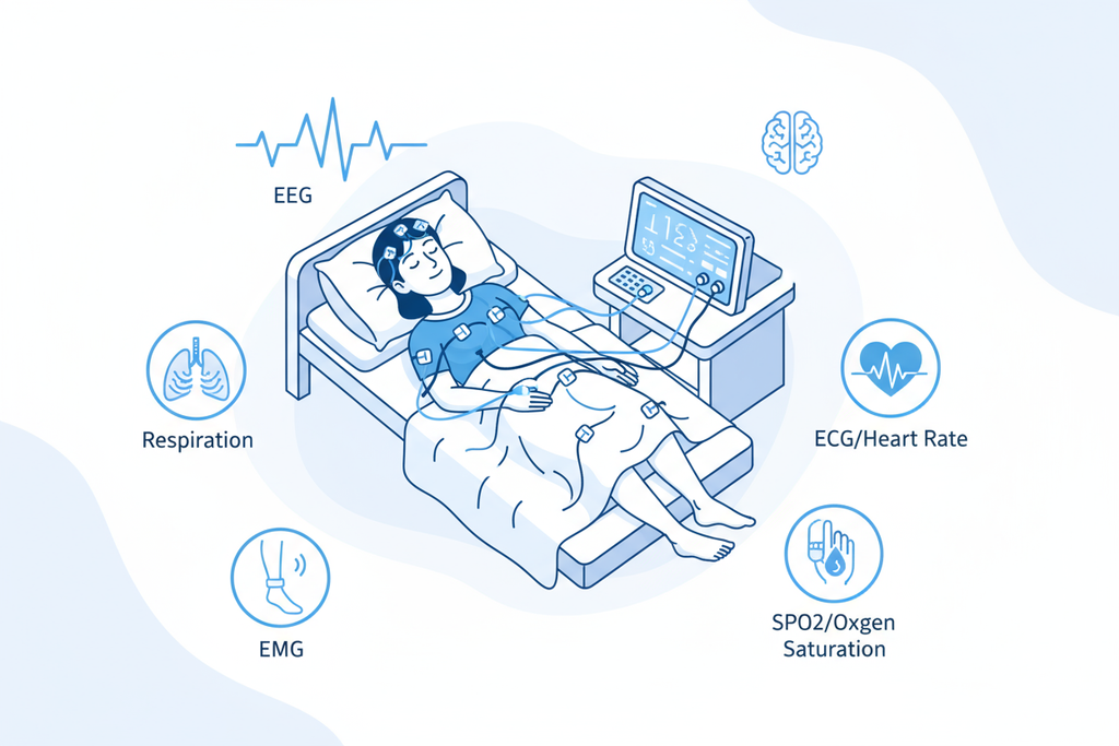 Exame do sono que monitora múltiplas funções fisiológicas durante o sono. Essencial para diagnóstico de apneia do sono, insônia e outros distúrbios do sono. Exame noturno completo, monitoramento contínuo, relatório detalhado.