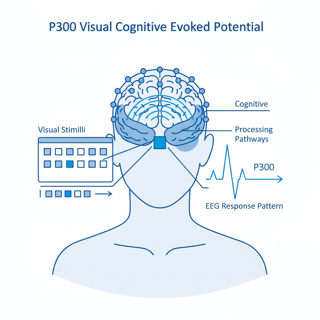 Exame que avalia a função cognitiva e a integridade das vias neurais. Útil para diagnóstico de demências, déficits cognitivos e monitoramento neurológico. Duração: 60 minutos, avaliação cognitiva, não invasivo.